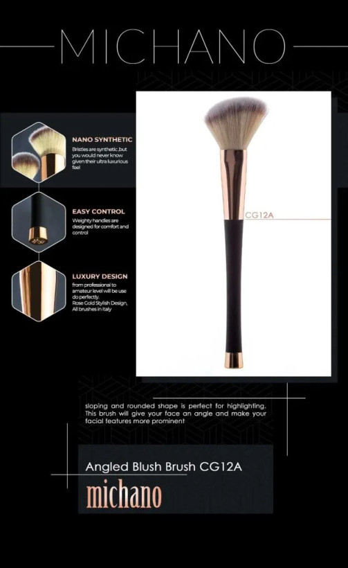 - یکی از مدلهای براش رژگونه و هایلایتر مدل زاویهدار است. خط رژگونه را به طور دقیق مشخص میکند. شکل اریب و گرد آن برای هایلایت کردن مناسب است. با این براش به گونه هایتان زاویه داده میشود و ویژگی های چهره تان برجسته تر نشان داده میشود.