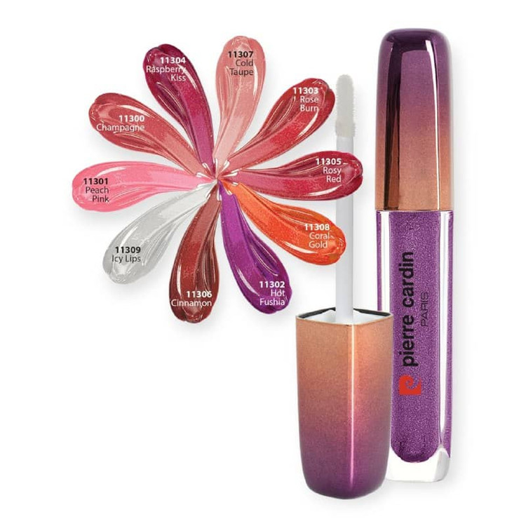 لیپ گلاس رنگی و درخشان پیرکاردین حاوی ذرات ریز درخشان و شاین با پیگمنت بالا، تونالیته رنگی قوی، بافت و رنگ مسحور کننده در زوایای مختلف میدرخشند،