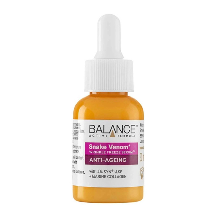 سرم ضد چروک سم مار و کلاژن دریایی بالانس یک پپتید ضد پیری بسیار قوی است. این سرم به خوبی پوست را مرطوب کرده و میزان چروکها و خطوط روی پوست را کاهش میدهد. این محصول باعث کاهش انقباضات ماهیچه ای می شود که یکی از دلایل اصلی ایجاد چین و چروک بر روی پوست میباشد. قدرت تاثیرگذاری این سرم بسیار سریع است و بعد از استفاده و گذشت ۱ دقیقه میزان انقباضات عضلات صورت ۳۶% کاهش پیدا کرده و بعد از سپری شدن ۲ دقیقه این میزان به ۸۲% میرسد که در نوع خودش بینظیر است. بعد از ۴ هفته استفاده مداوم از این سرم، میزان خطوط صورت تا ۵۲% کاهش پیدا میکند.